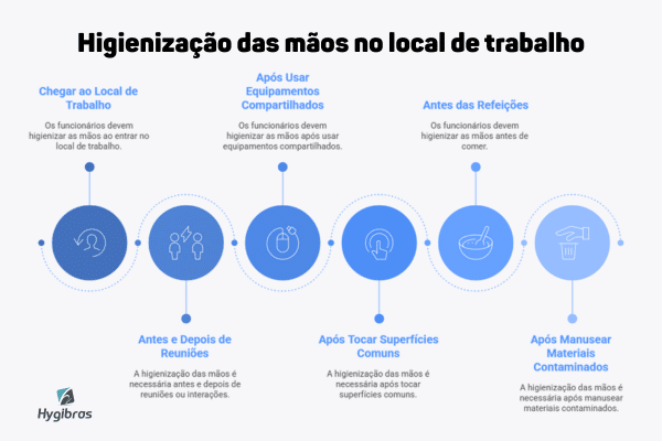 Os principais momentos para higienização das mãos no ambiente corporativo são: