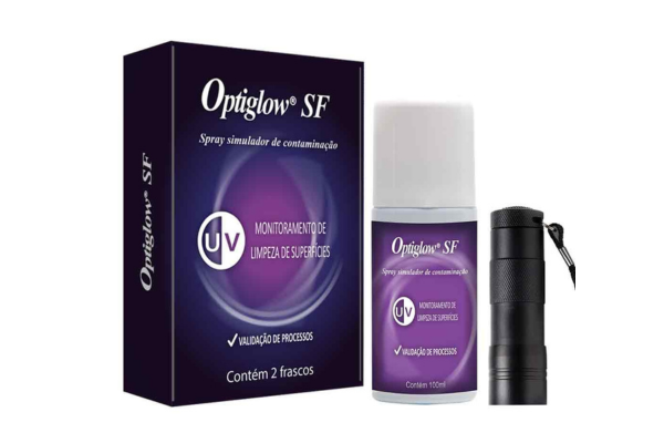 Além do teste ATP tradicional, existem soluções complementares que fortalecem os protocolos de higienização. Um exemplo é o Optiglow, um kit desenvolvido para treinamento de equipes. Ele utiliza uma solução em spray com agente fluorescente que pode ser visualizado sob luz ultravioleta. Dessa forma, a equipe consegue enxergar pontos que passaram despercebidos na limpeza, reforçando a atenção a áreas críticas.