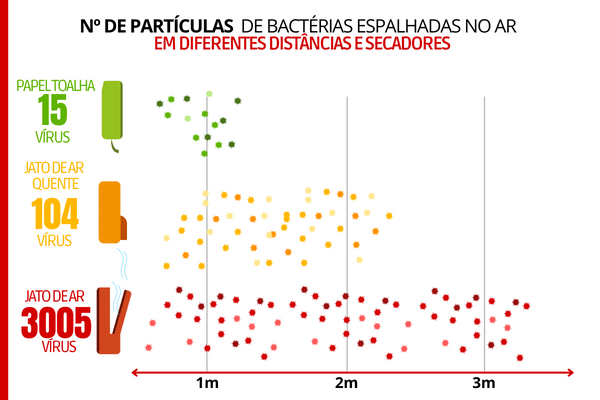 - Secadores de jato dispersavam 20 vezes mais vírus que o secador de ar quente e mais de 190 vezes que as toalhas descartáveis de papel;